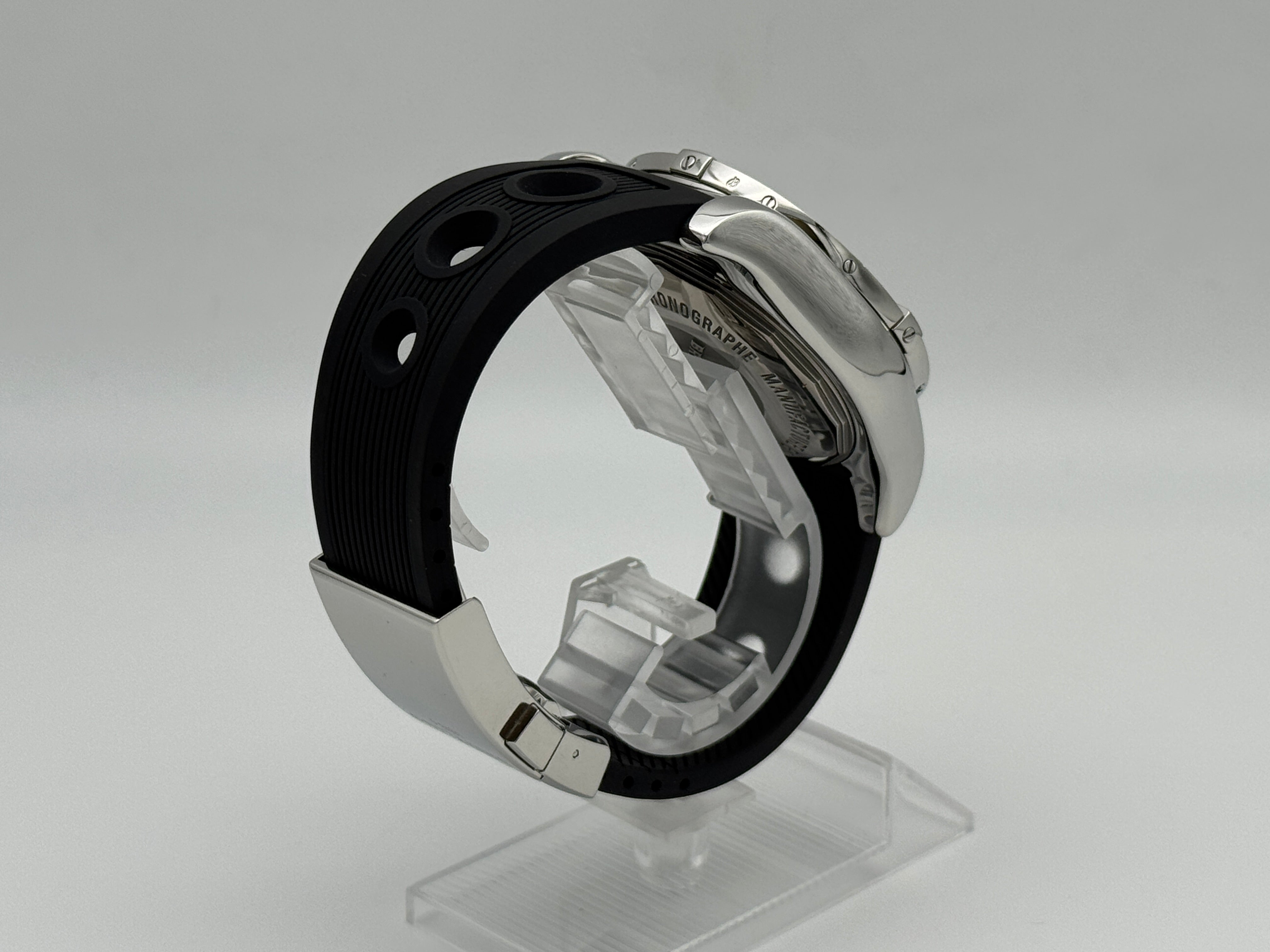Das große 46 mm Edelstahlgehäuse verleiht der Uhr Präsenz am Handgelenk, ohne an Eleganz zu verlieren. Das tiefschwarze Zifferblatt mit kontrastierenden Totalisatoren, weißen Indexen und leuchtstarken Zeigern sorgt für hervorragende Lesbarkeit – bei Tag und Nacht.