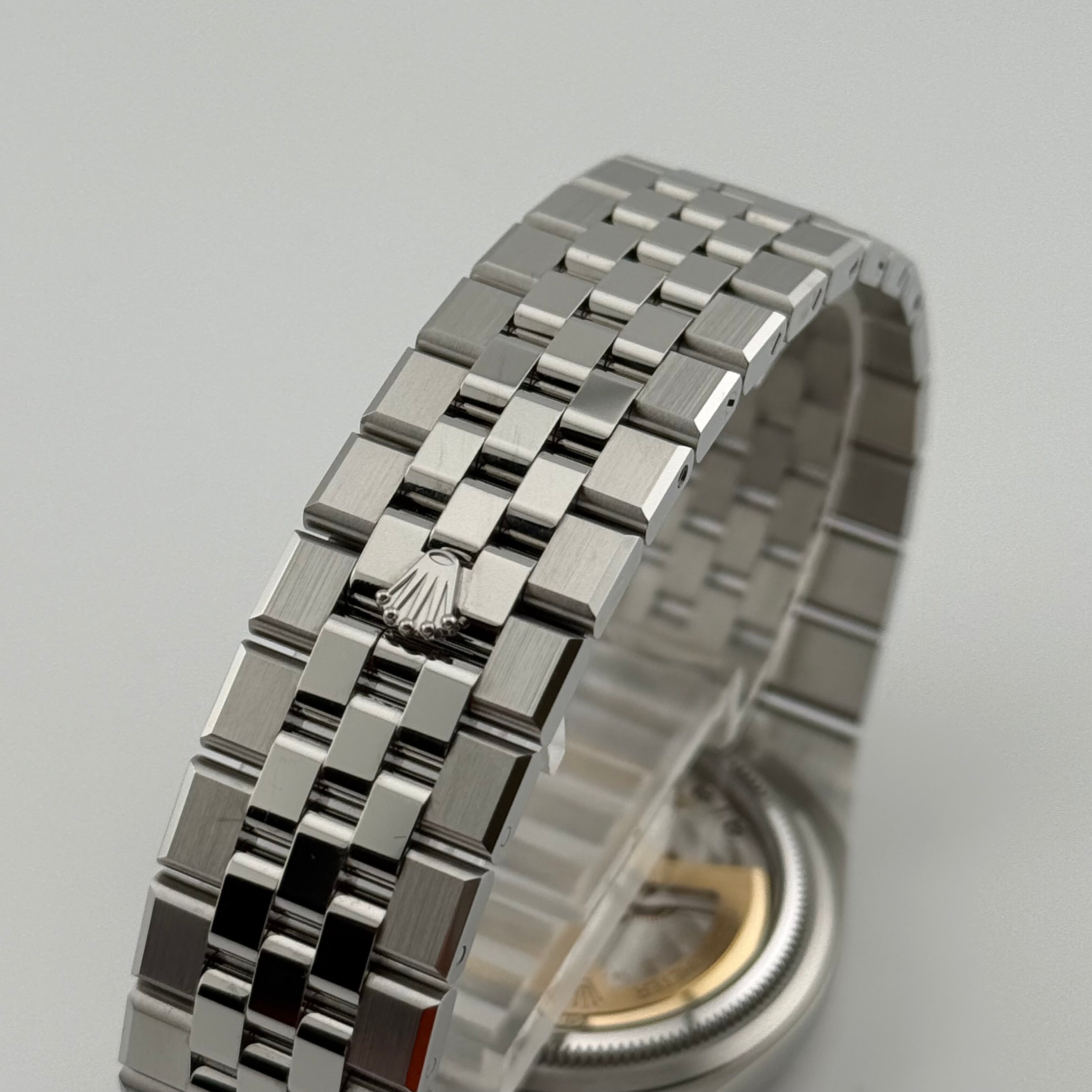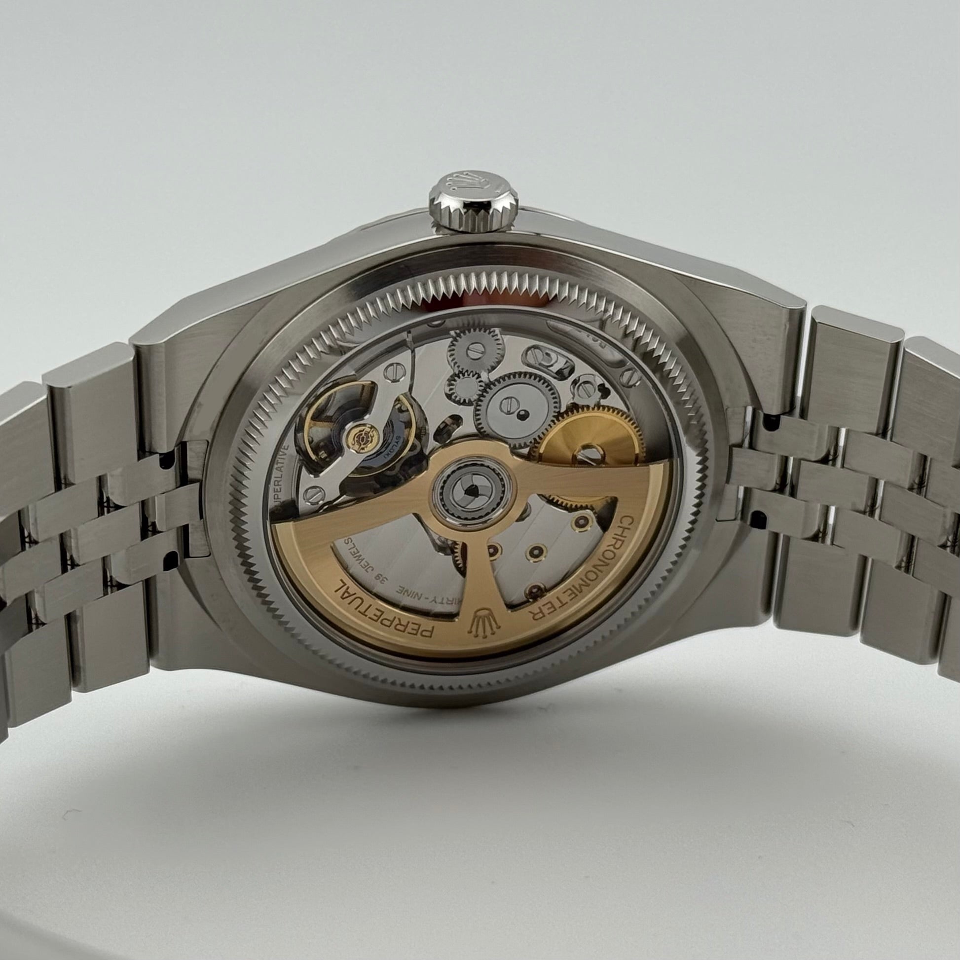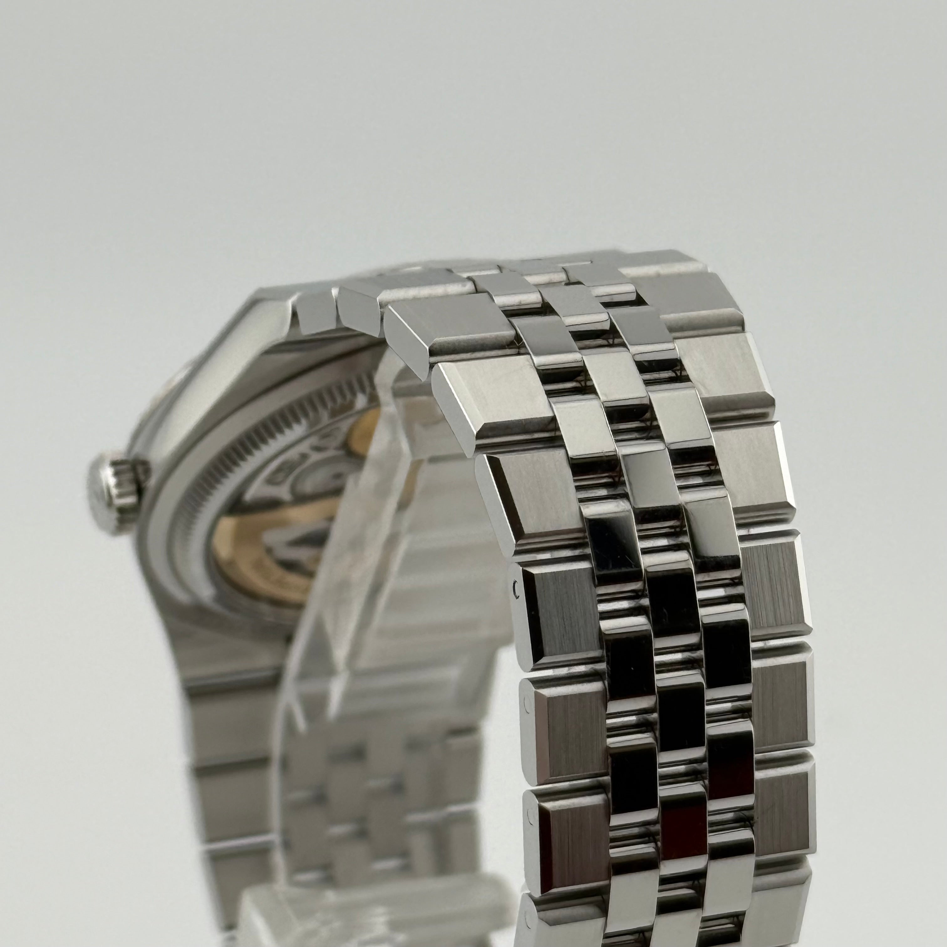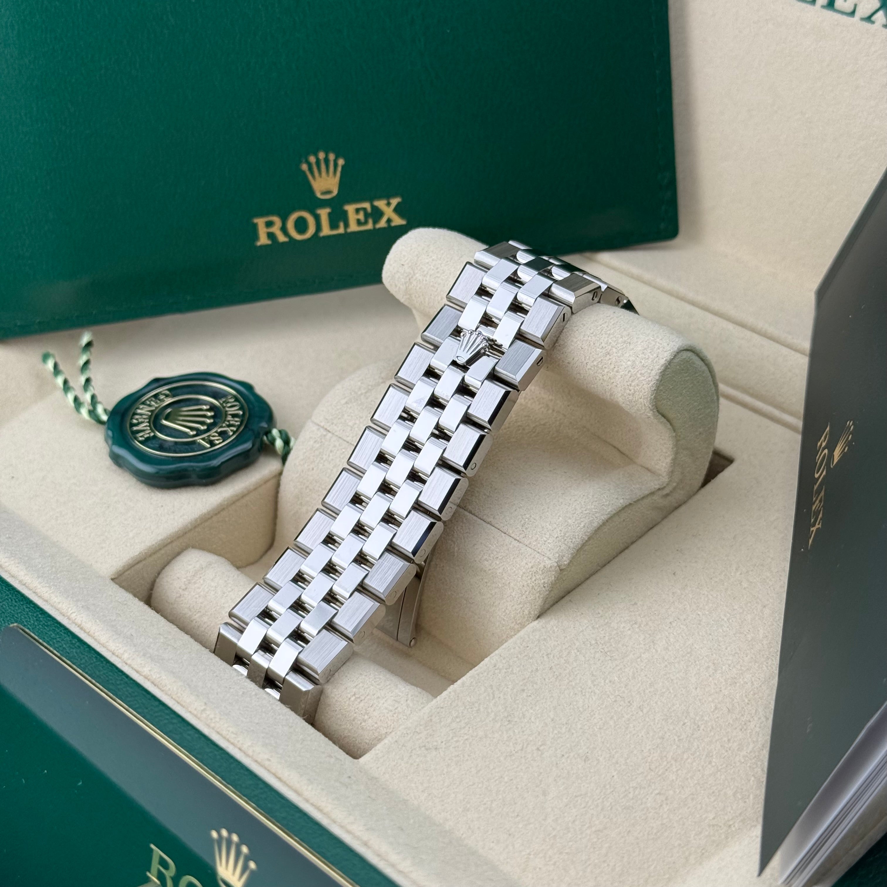Besonderes Highlight dieser Referenz ist das sogenannte Flat Jubilee Band. Es greift die ikonische Jubilee-Optik auf, interpretiert sie jedoch flacher, technischer und vollständig integriert in das Gehäusedesign. Dadurch entsteht ein harmonischer, durchgängiger Look mit hohem Tragekomfort und moderner Ästhetik. Die Kombination aus polierten und satinierten Flächen unterstreicht den hochwertigen Charakter dieser Ausführung.