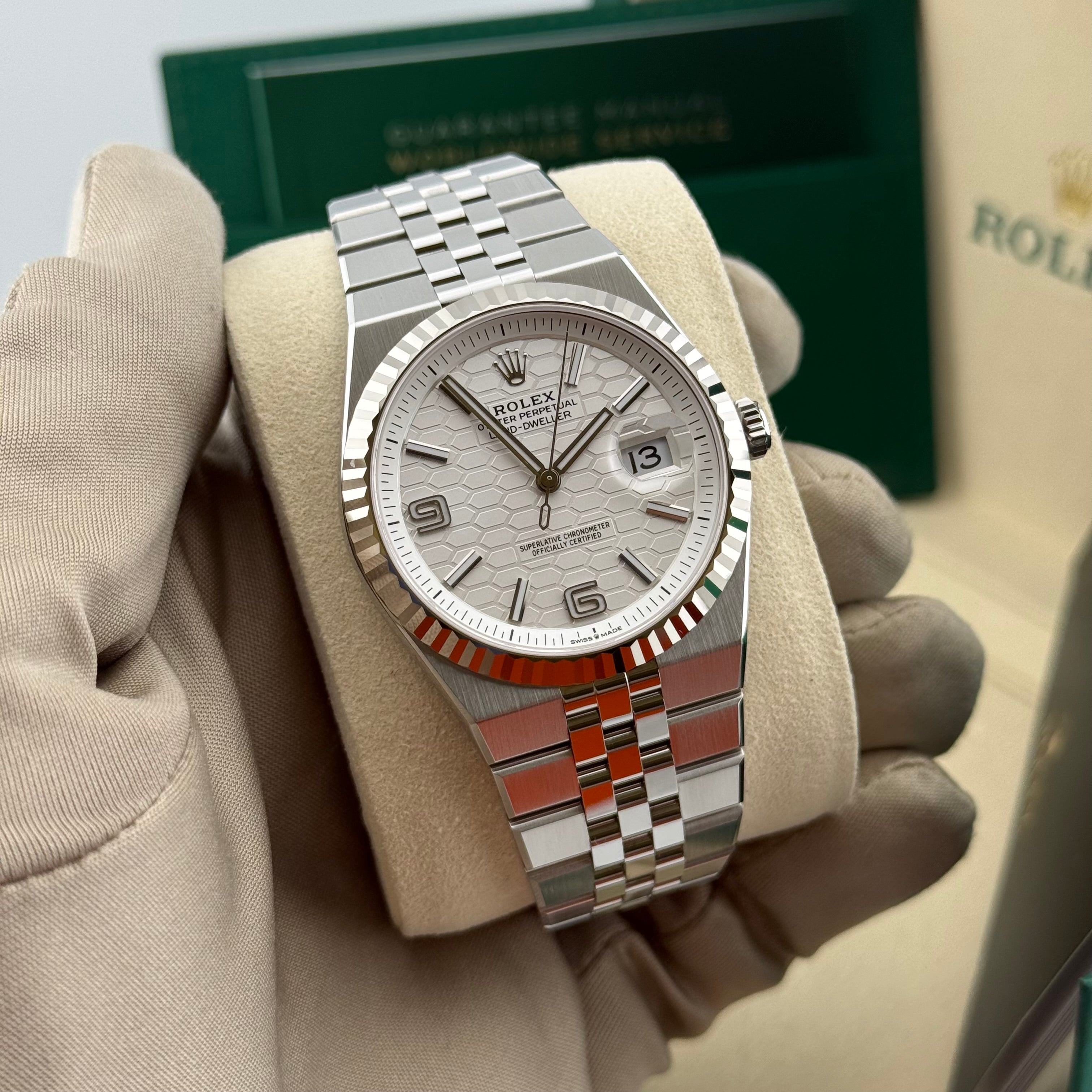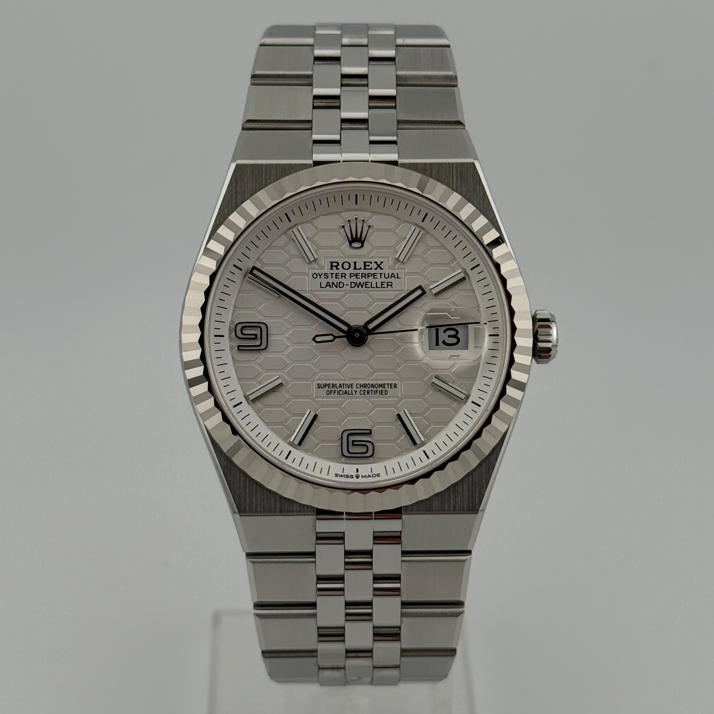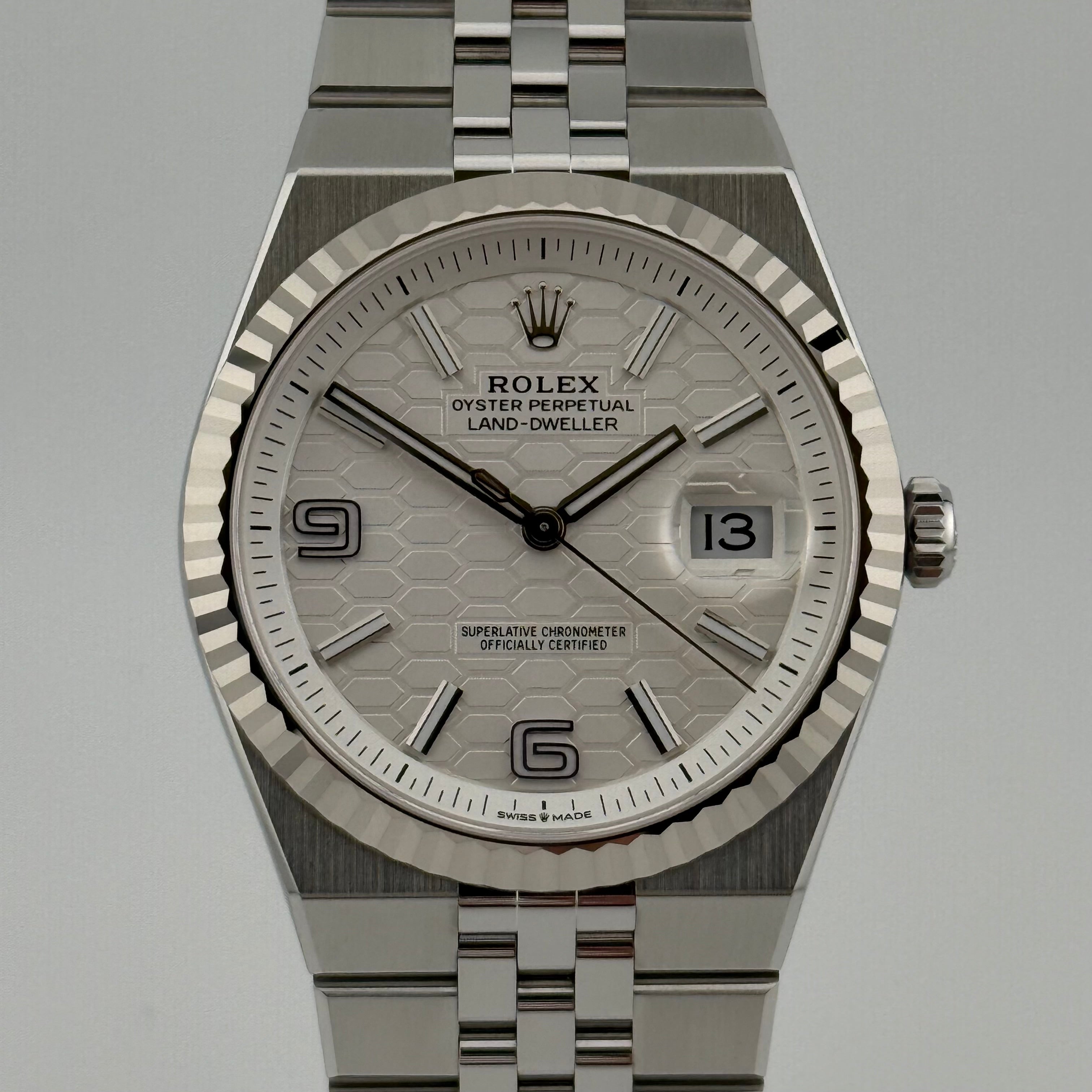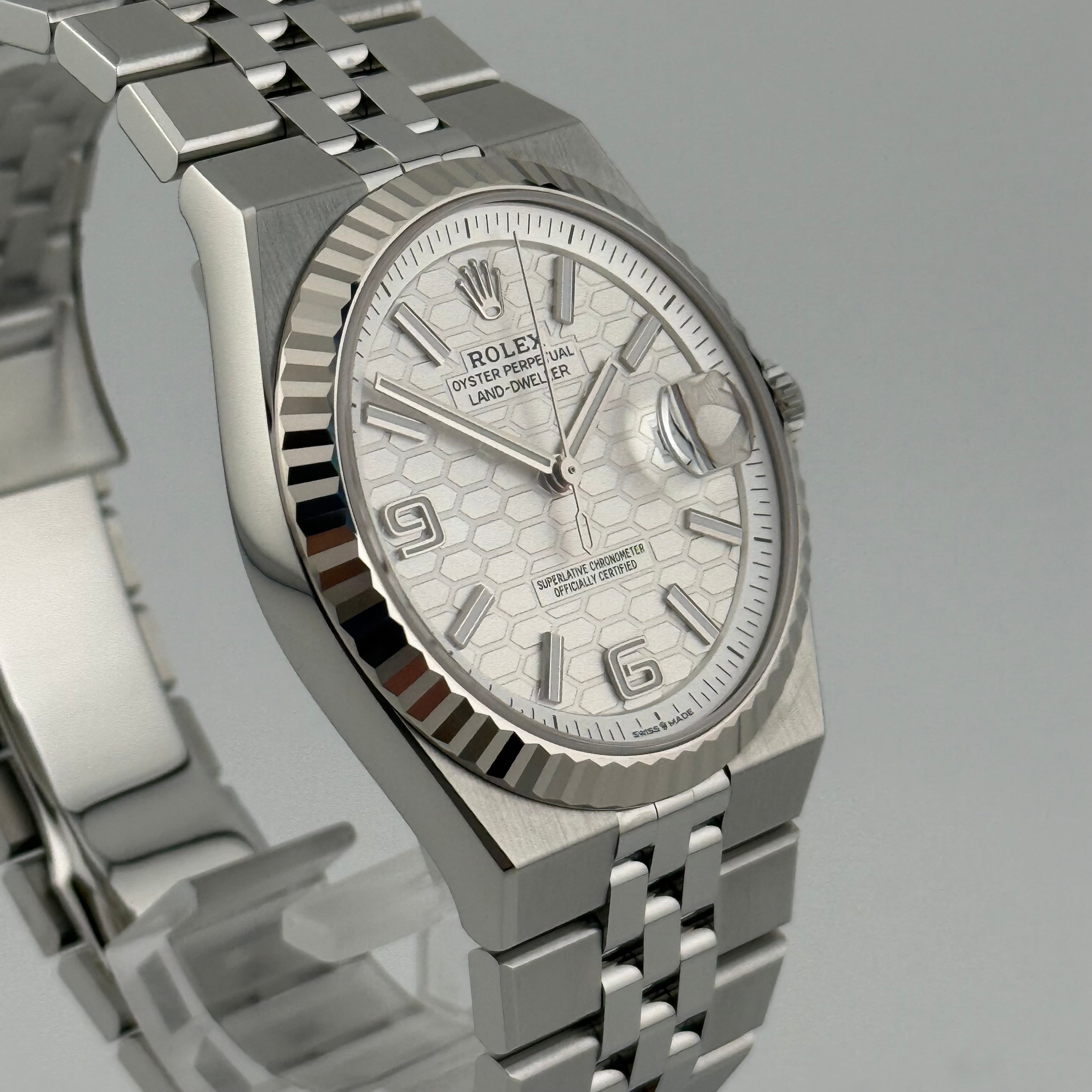 Mit der Land-Dweller 40 Ref. 127334 präsentiert Rolex ein Modell, das klassische Elemente der Marke neu interpretiert. Die 40 Millimeter große Gehäusegröße wirkt modern und ausgewogen, während die klaren Kanten und satinierten Flächen für eine kraftvolle, architektonische Präsenz sorgen. Die geriffelte Lünette aus 18 Karat Weißgold bleibt dabei das unverkennbare Markenzeichen und sorgt für das typische Lichtspiel, das Rolex seit Jahrzehnten auszeichnet.