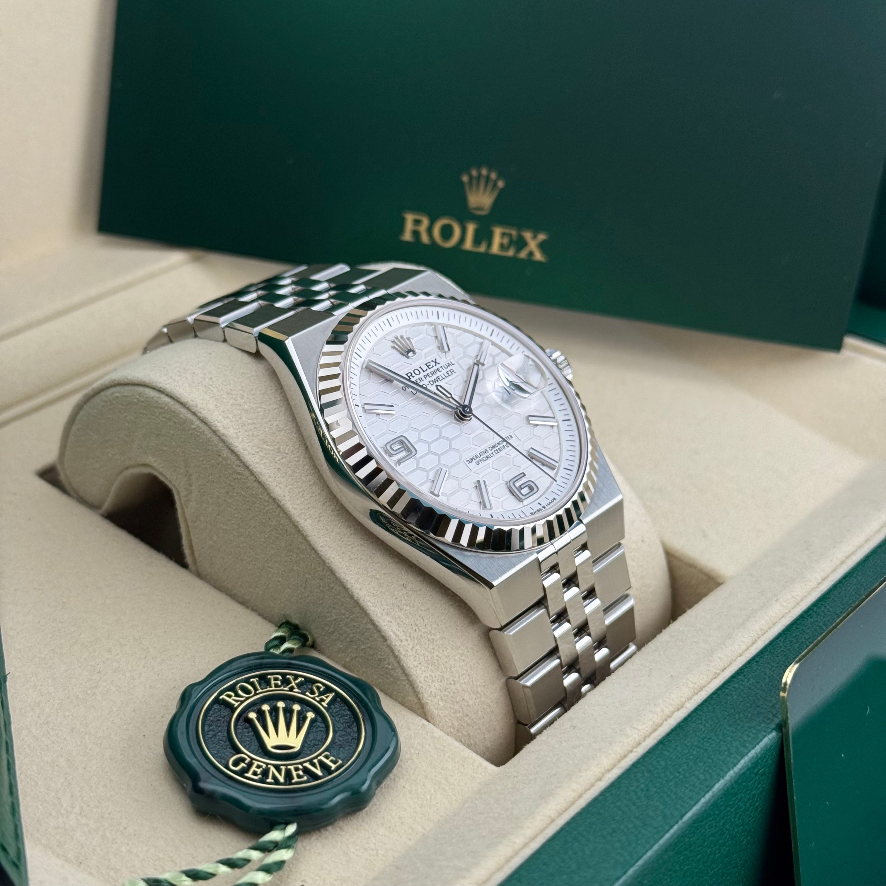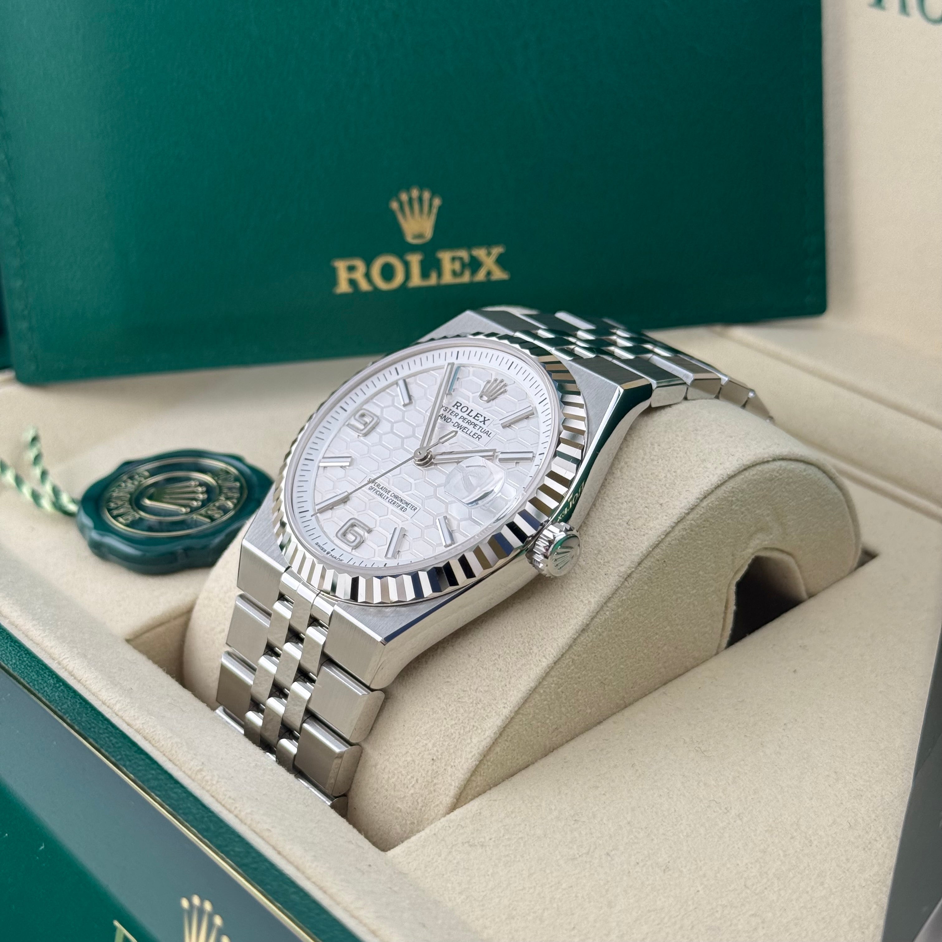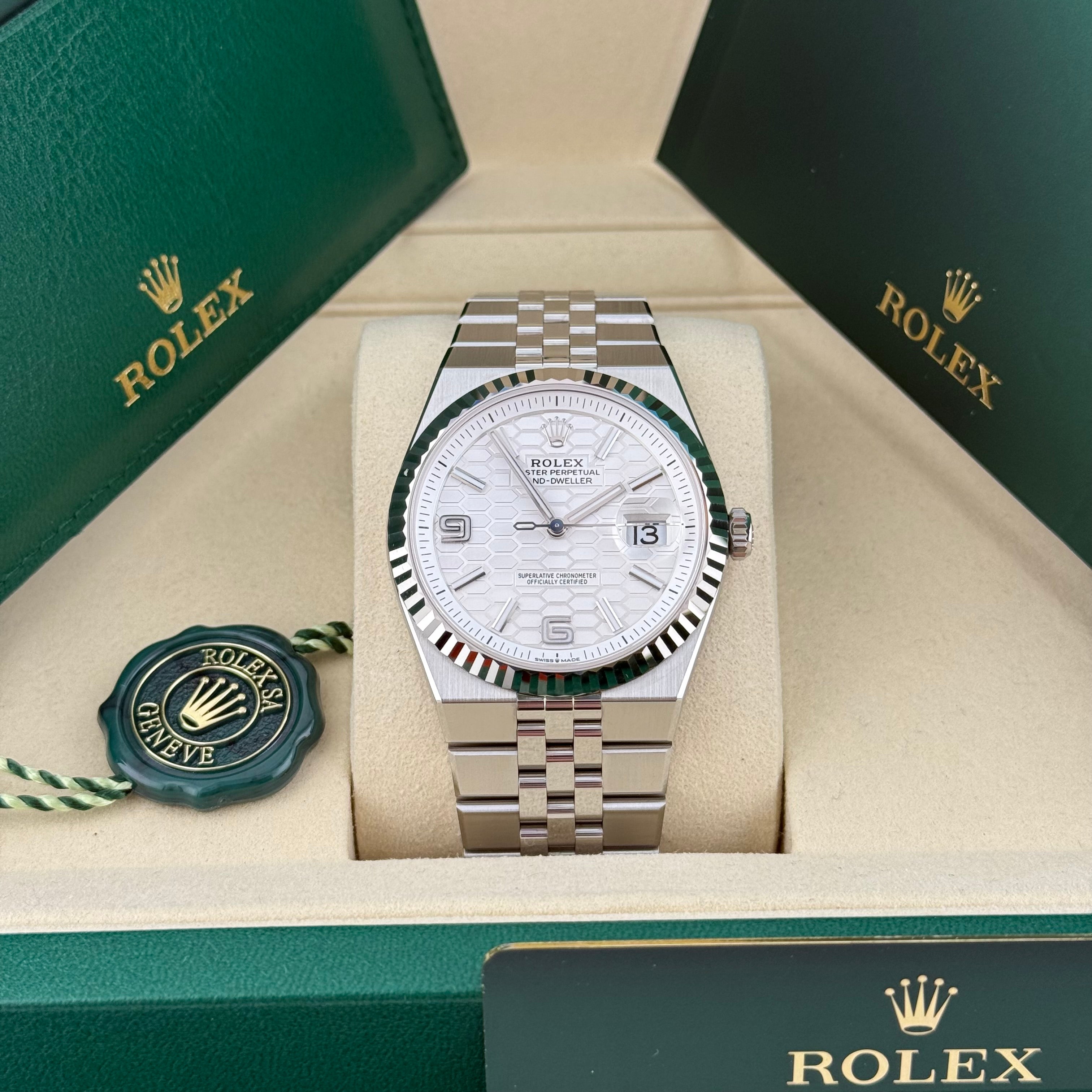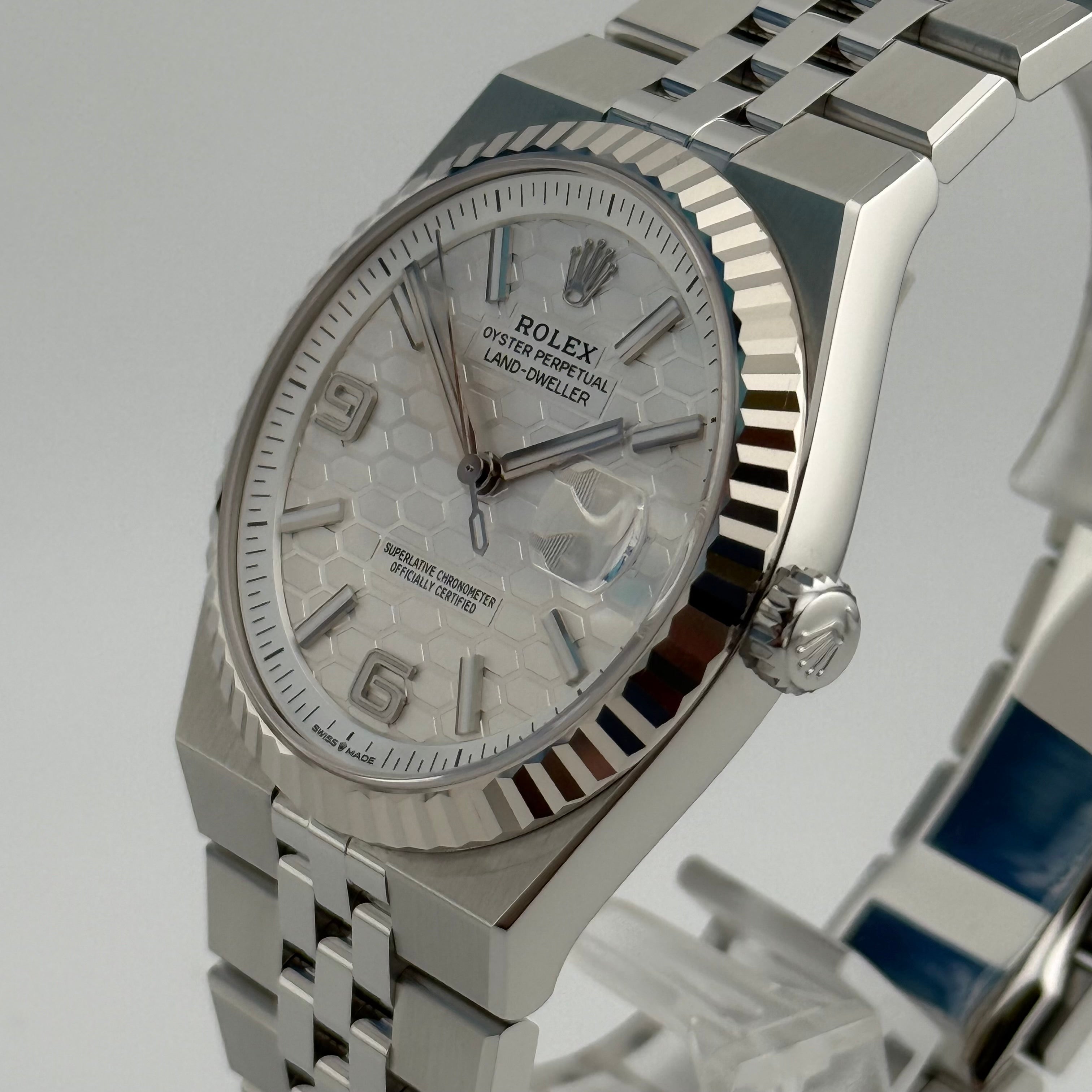 Mit der Land-Dweller 40 Ref. 127334 präsentiert Rolex ein Modell, das klassische Elemente der Marke neu interpretiert. Die 40 Millimeter große Gehäusegröße wirkt modern und ausgewogen, während die klaren Kanten und satinierten Flächen für eine kraftvolle, architektonische Präsenz sorgen. Die geriffelte Lünette aus 18 Karat Weißgold bleibt dabei das unverkennbare Markenzeichen und sorgt für das typische Lichtspiel, das Rolex seit Jahrzehnten auszeichnet.