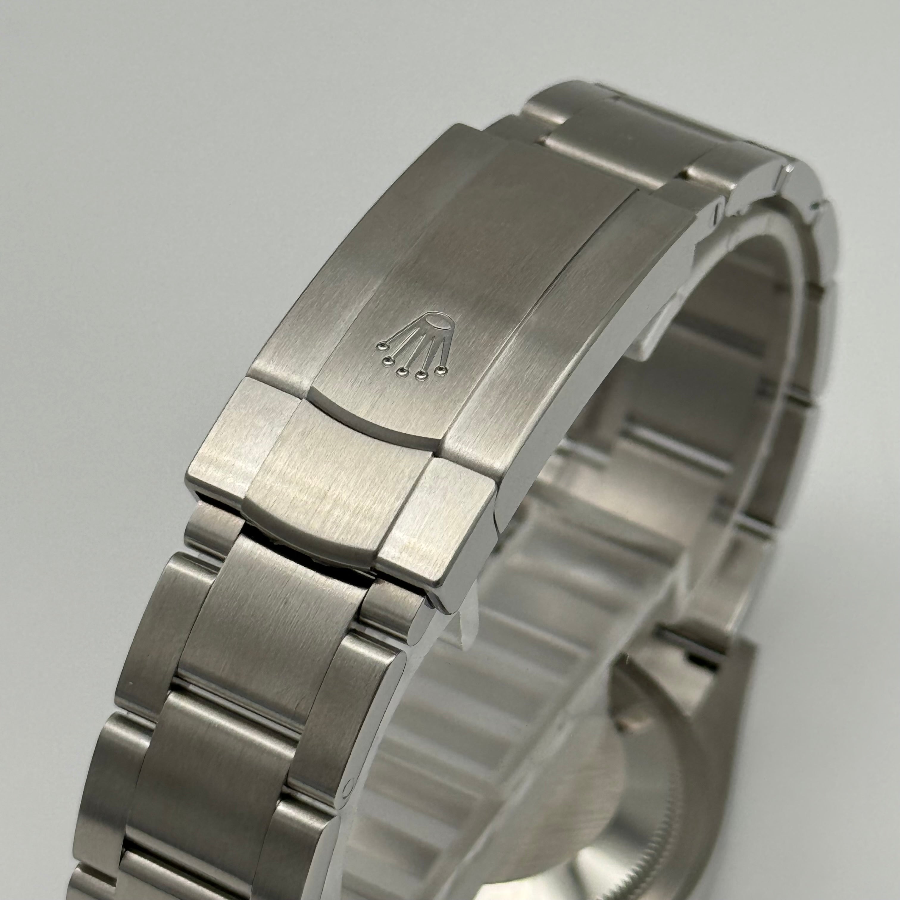 Das Gehäuse besteht aus Rolex-eigenem Oystersteel, einer besonders korrosionsresistenten Edelstahllegierung, die für außergewöhnliche Robustheit und langanhaltenden Glanz sorgt. Die polierte glatte Lünette, das klare Zifferblatt mit applizierten Indizes sowie die klassische Oyster-Schließe verleihen der Uhr einen zurückhaltend-eleganten Auftritt.