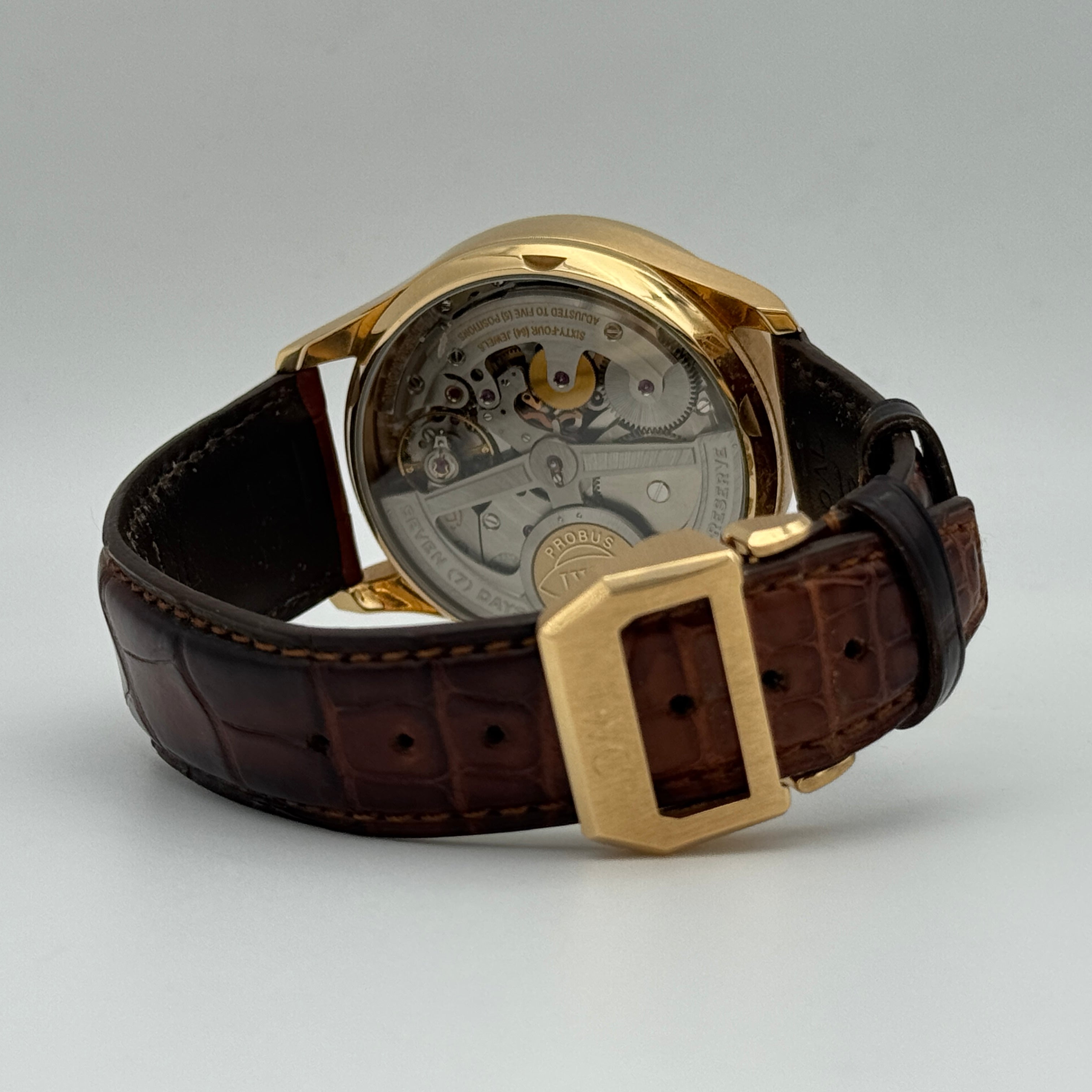 Die IW502213 präsentiert sich mit einem 44,2 mm großen Gehäuse aus 18 Karat Rotgold, das perfekt mit dem silberfarbenen Zifferblatt und den goldenen Appliken harmoniert. Die schmalen Feuille-Zeiger, die typische Eisenbahnminuterie und die symmetrisch angeordneten Kalenderanzeigen verleihen der Uhr eine klassische, ausgewogene Optik.