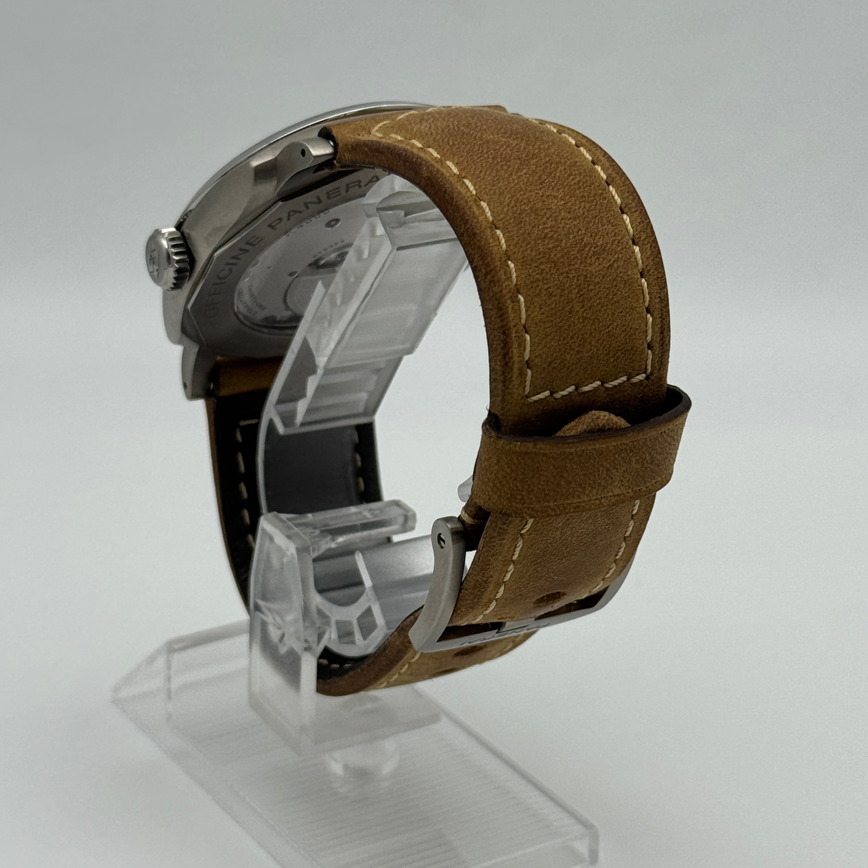 Das Gehäuse der PAM00619 besteht aus gebürstetem Titan, was die Uhr trotz ihrer Größe angenehm leicht und besonders widerstandsfähig macht. Die kissenförmige Luminor 1940 Form mit ihren klaren Linien und ohne den typischen Kronenschutzbügel sorgt für eine reduzierte, elegante Silhouette – ideal für Kenner, die auf Understatement setzen.