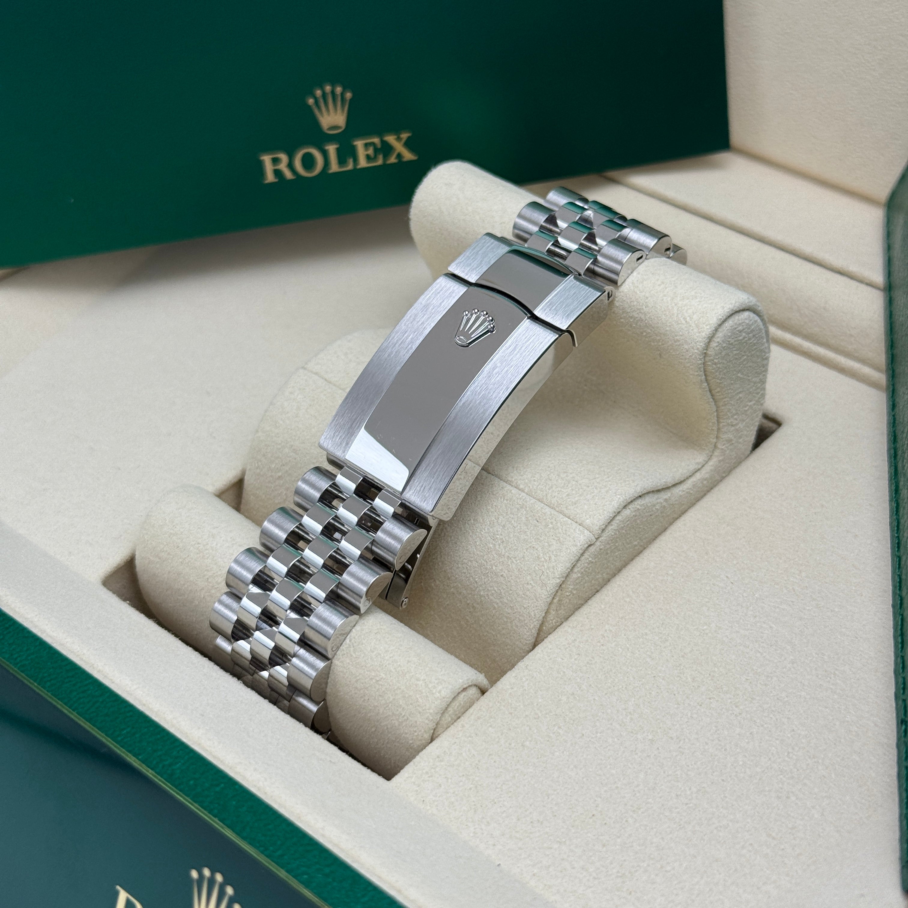Das 42 Millimeter große Gehäuse aus Edelstahl (Oystersteel) wird durch eine geriffelte Weißgoldlünette aus 18 Karat veredelt – ein typisches Merkmal vieler Sky-Dweller-Modelle. Das tiefschwarze Zifferblatt schafft einen edlen Kontrast zu den weißgoldenen Appliken und Zeigern, die mit Leuchtmasse ausgestattet sind und für perfekte Ablesbarkeit bei Tag und Nacht sorgen. Der integrierte Jahreskalender ist durch das rot markierte Monatsfenster über den Indizes intuitiv ablesbar. Das klassische GMT-Ringdisplay in der Mitte bietet eine zweite Zeitzone mit 24-Stunden-Anzeige. Das fünfreihige Jubilee-Band rundet den Auftritt ab – es verleiht der sportlich-technischen Uhr eine elegante Note und sorgt für hohen Tragekomfort.
