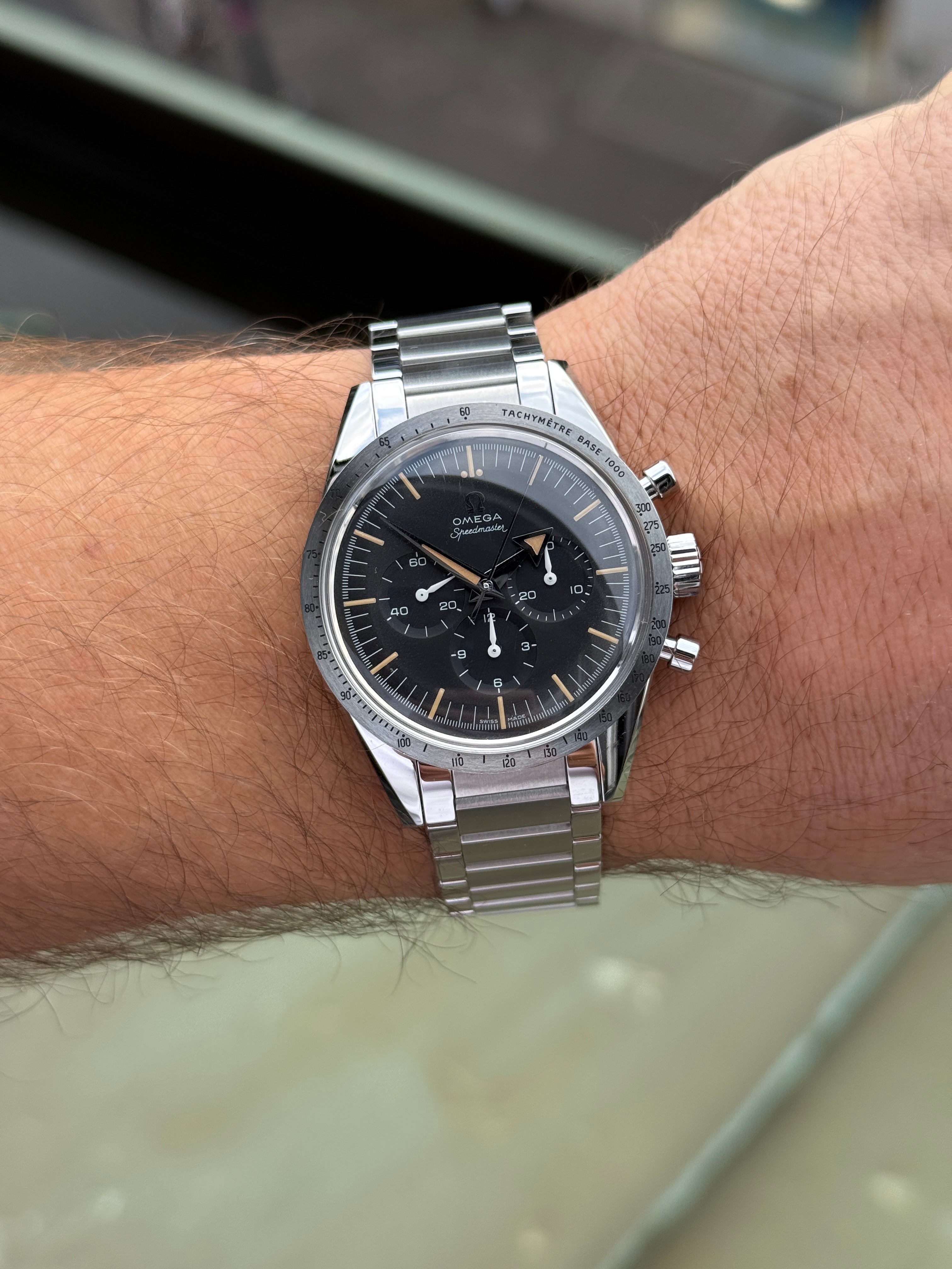 Das 39 mm Edelstahlgehäuse, das markante „Broad Arrow“-Zeigerspiel und die mattschwarze Aluminiumlünette sind eine nahezu originalgetreue Rekonstruktion des Urmodells. Auch das Zifferblatt mit dem klassisch gestuften Aufbau, den applizierten Indizes und der typischen Dreifach-Anordnung der Totalisatoren ist eine klare Reminiszenz an die Speedmaster der 1950er-Jahre. Ergänzt wird das Ganze durch ein fein verarbeitetes Edelstahlband, das den Vintage-Charme mit zeitgemäßem Tragekomfort verbindet.
