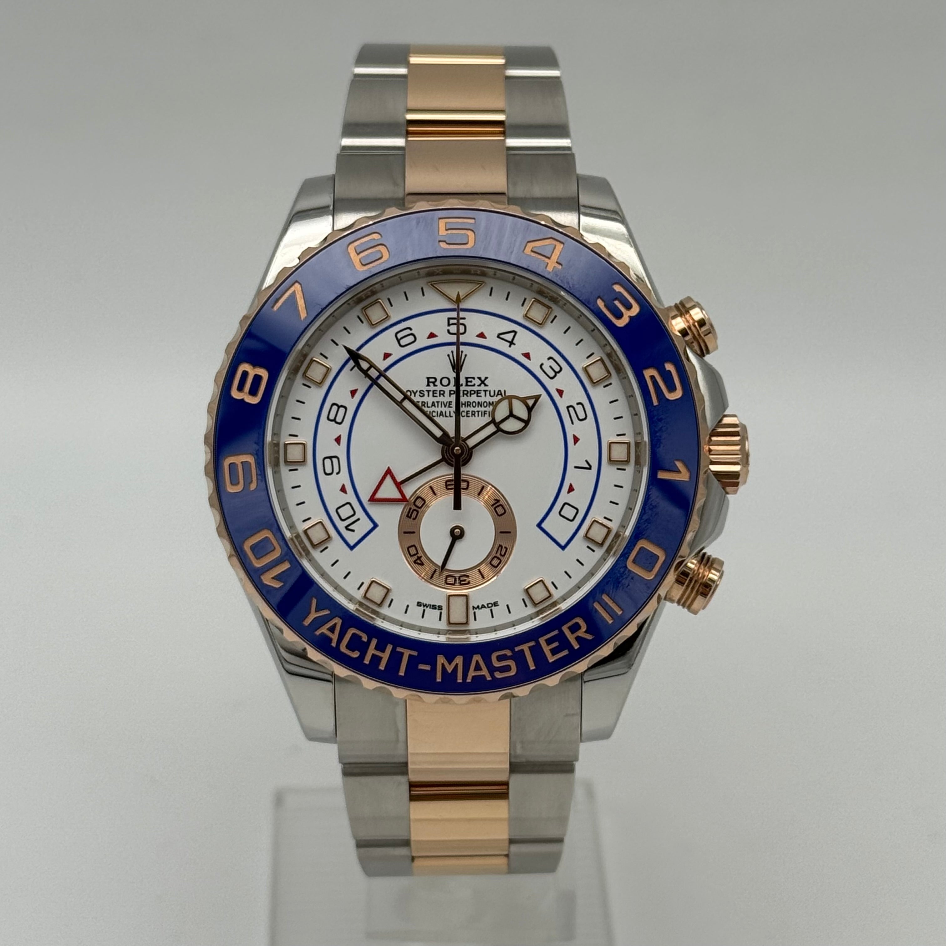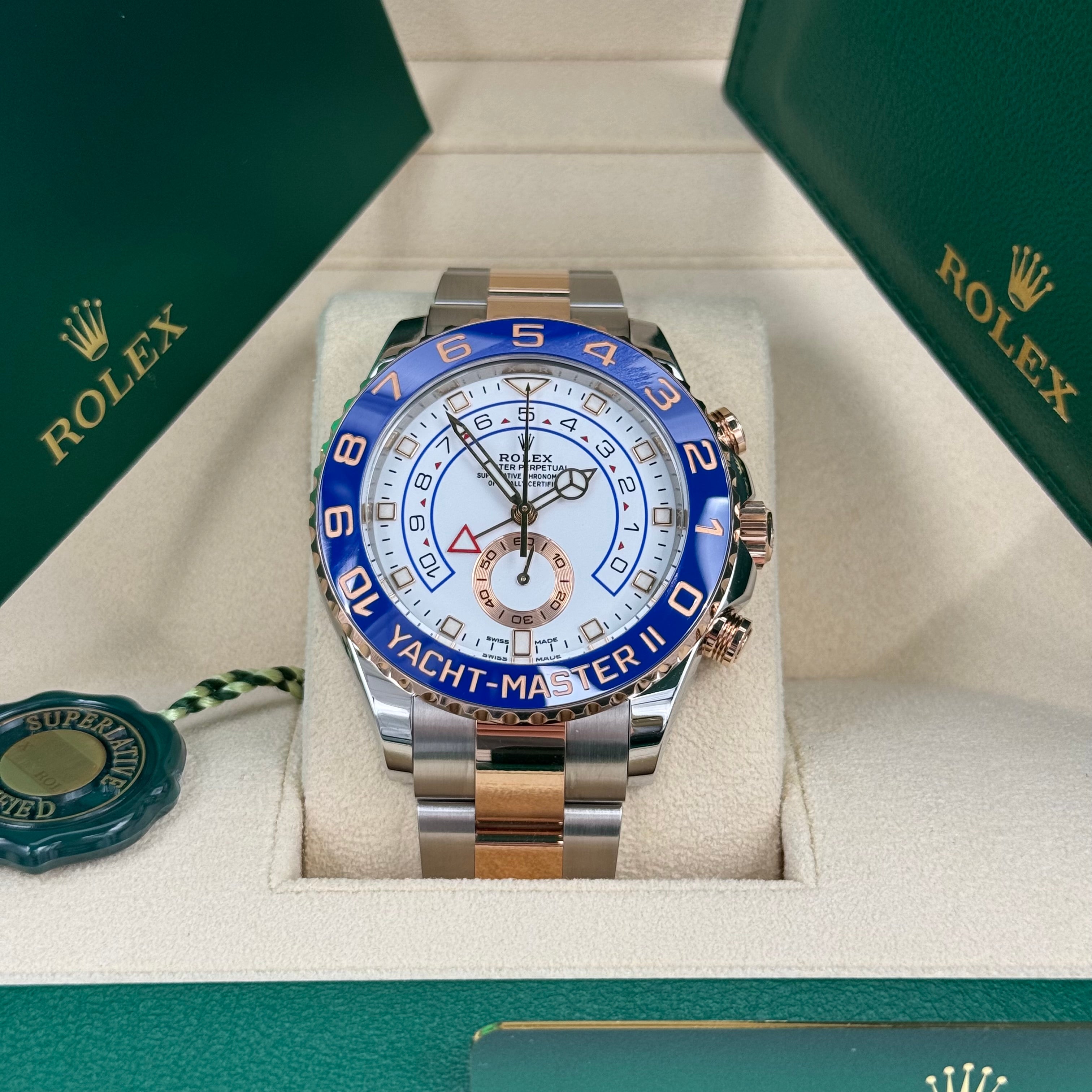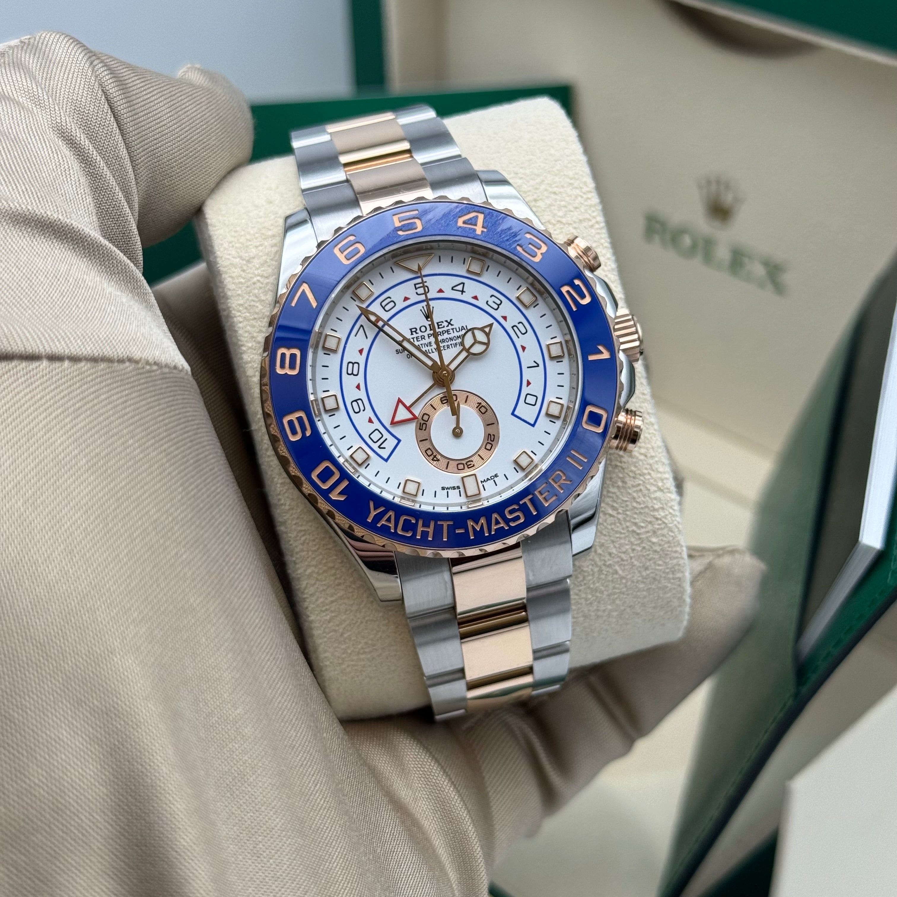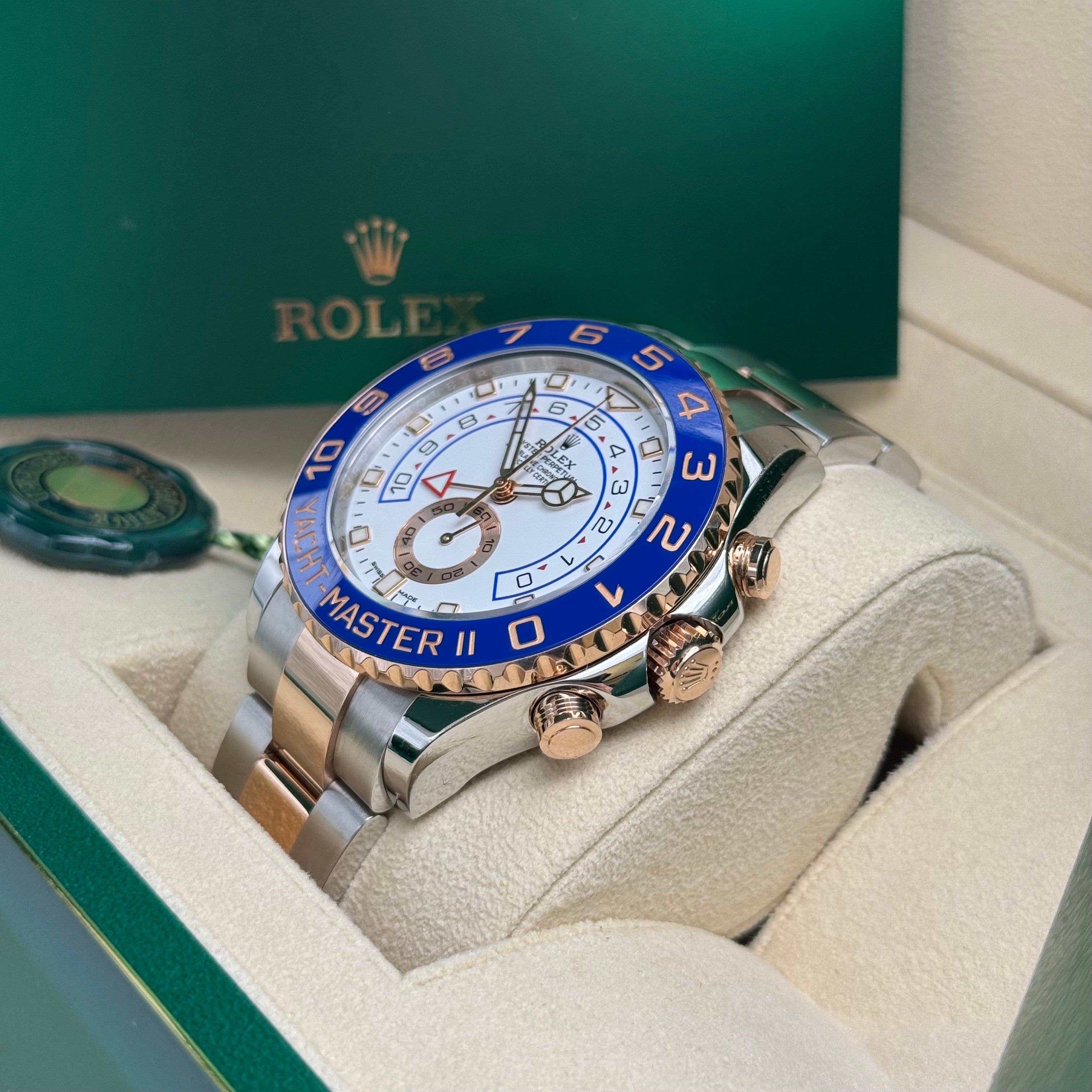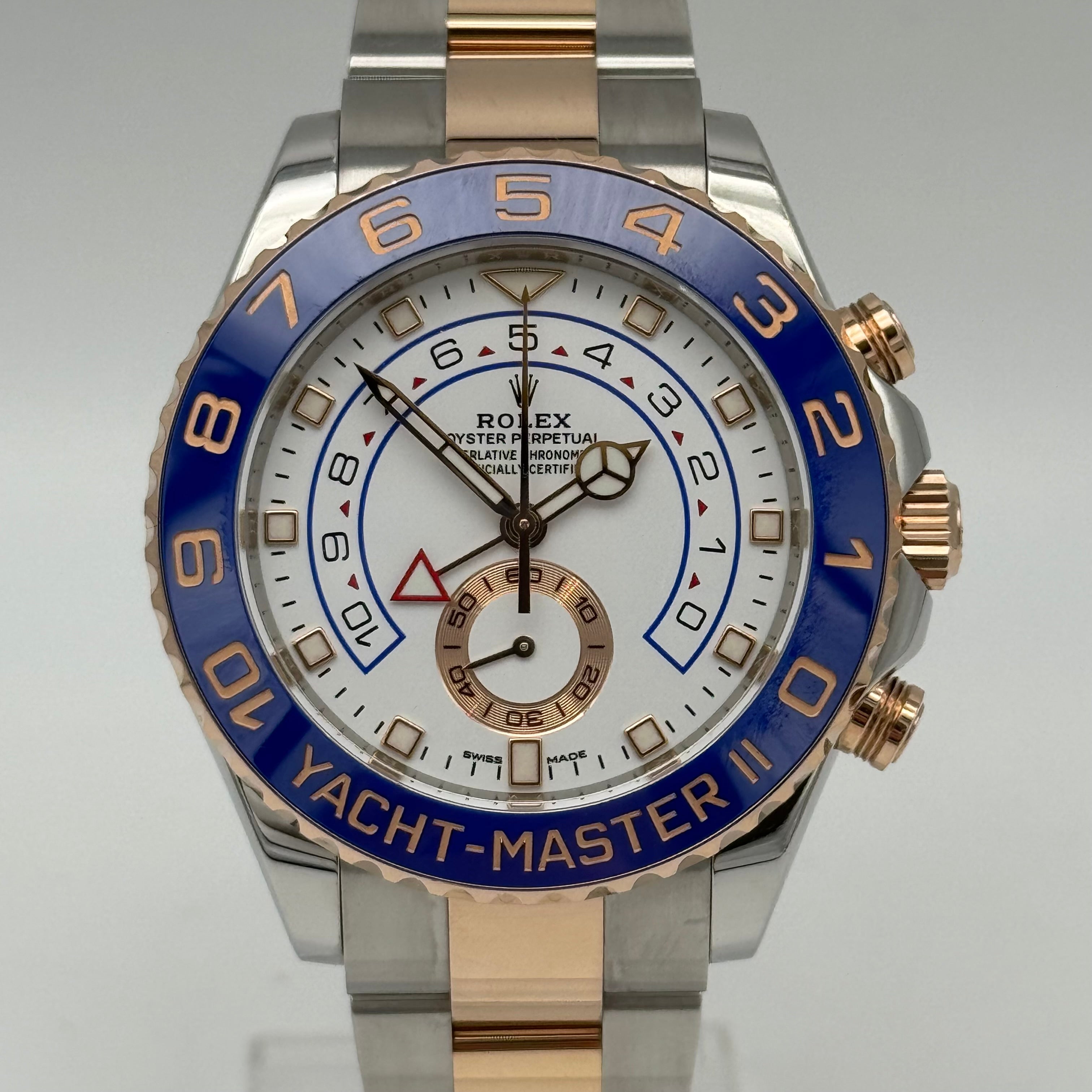 Die Yacht-Master II Ref. 116681 ist eines der technisch außergewöhnlichsten Modelle von Rolex. Entwickelt für den professionellen Segelsport, kombiniert sie hochkomplexe Mechanik mit einer unverkennbaren, luxuriösen Optik in Edelstahl und Everose Gold. Mit einem Durchmesser von 44 Millimetern besitzt sie eine kraftvolle Präsenz und zählt zu den markantesten Sportmodellen der Marke.